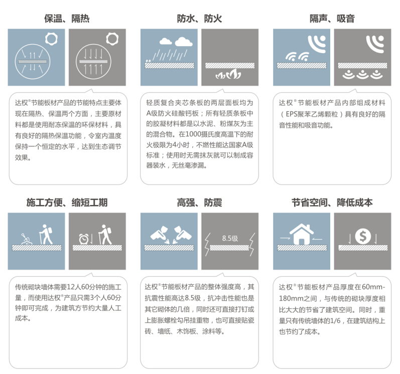达权防水隔墙特性:达权防水隔墙具有良好的防水、防潮性能,可用于厨房、卫生间、地下室等潮湿区域,墙体不会因吸潮而松化、返卤、变形、强度下降等现象。